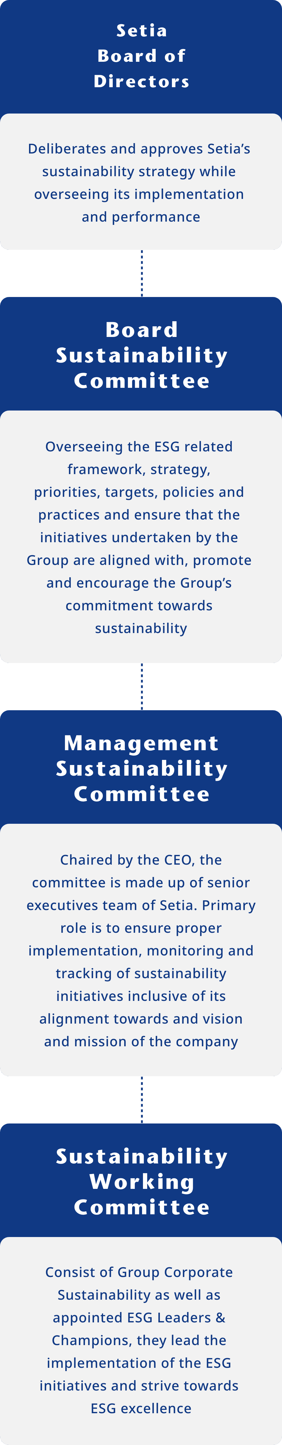 The Management Sustainability Committee,chaired by the CEO, ensures that implementation as well as monitoring occurs in line with Setia’s vision and mission. The Sustainability Working Committee, comprised of Group Corporate Sustainability and appointed ESG Leaders and Champions, thereby carries out the necessary actions and implementation exercises to achieve Setia’s sustainability-related objectives.